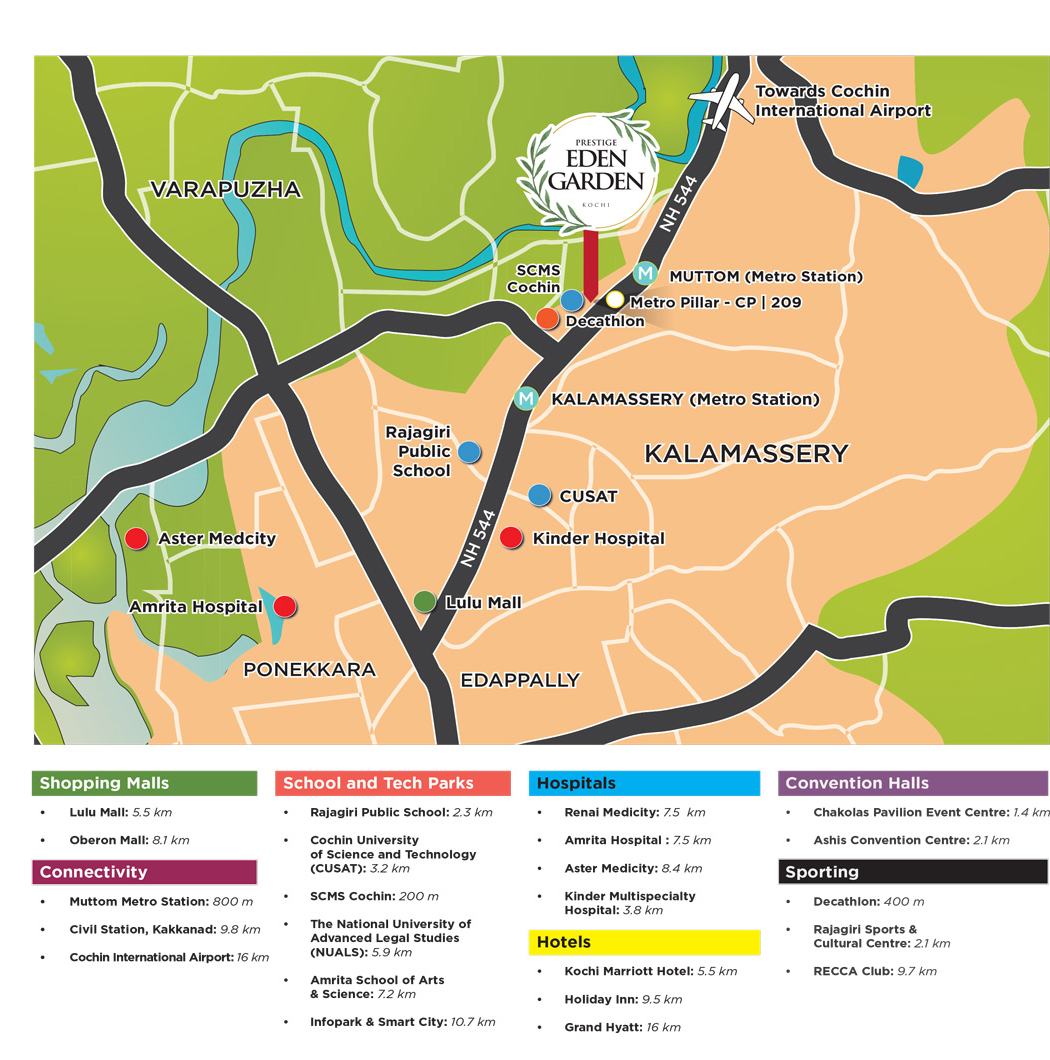 Prestige Eden Garden is located within driving distance of well-reputed educational institutions, shopping malls, hospitals and hotels. It is on the Metro route and the Cochin International Airport is a 30-minute drive away. The scenic Container Terminal Road is also close by