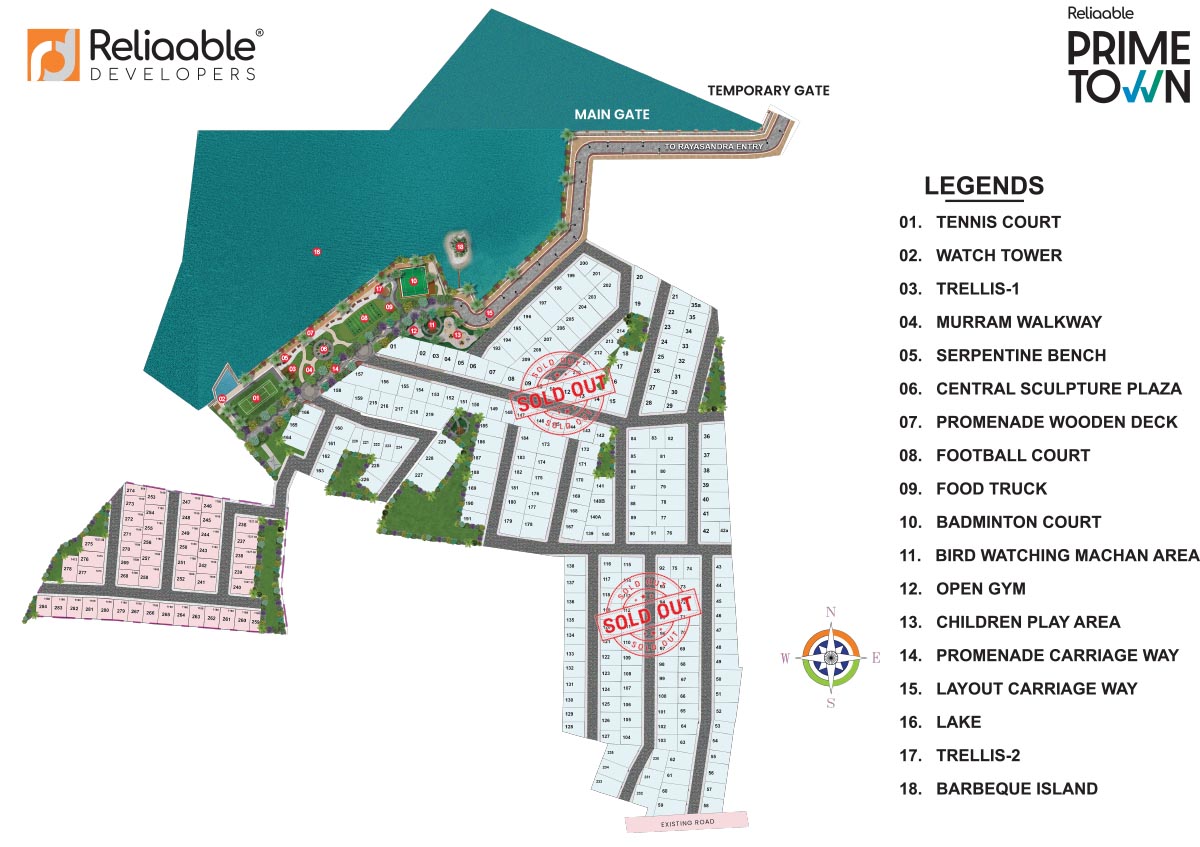 Reliaable Prime Town is a premium lakeside plotted development located off Sarjapur Road, near HSR Layout, Bangalore. Spanning 30 acres, it stands out as one of the most exclusive plotted communities within Bengaluru city, offering a 1000 ft. lake promenade and extensive green coverage that enhances its tranquil setting.